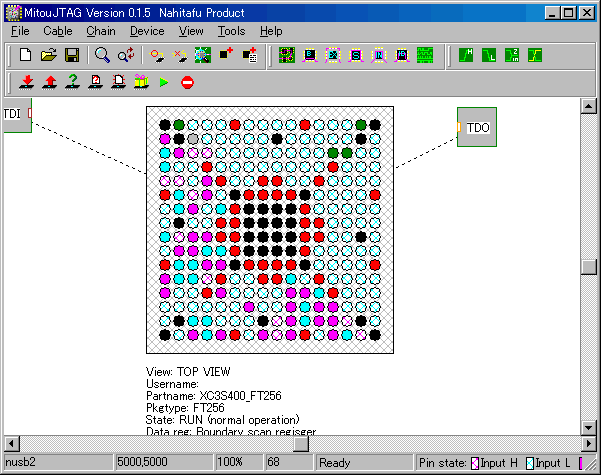 MITOUJTAGでは、EXTESTあるいはINTEST状態で端子の絵をクリックすると、その端子を自由自在に操作することができます。下の図はSUZAKUのFPGAに対してINTESTを実行している最中の図です。