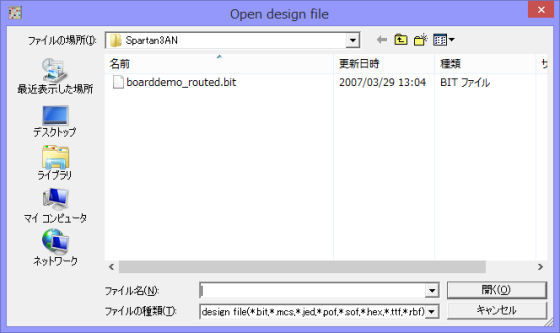 書き込む拡張子は.BITで構いません。MITOUJTAGがBitStreamを書き込み時に自動的にMCSに変換して書き込むので、iMPACTでMCSに変換する必要はありません。