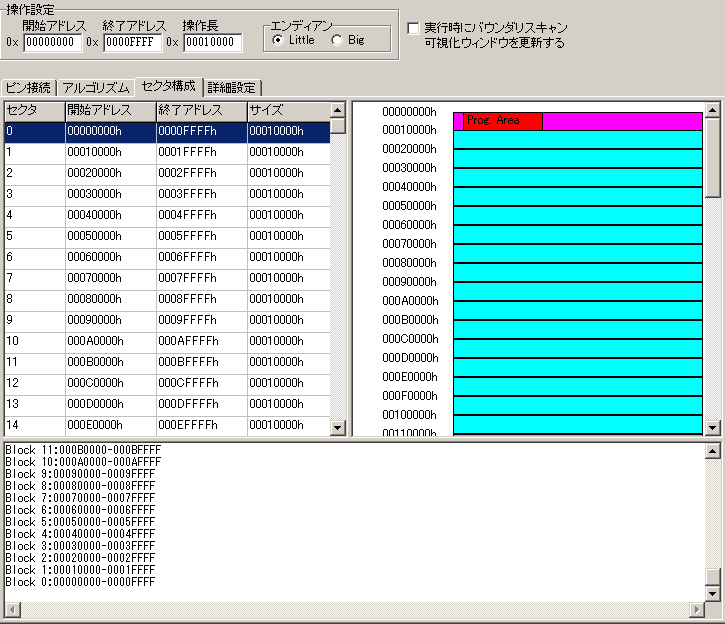 ここで、「セクタ消去」を選択すると現在選択されているセクタのみが消去され、「チップ全体」を選択するとチップ全体を消去します。