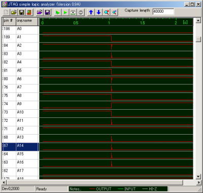 ロジックアナライザを起動したら、Mobile JTAG Cableの非同期モードでキャプチャを開始します。非同期モードでは、ほぼ1ms周期でSH-4の全IOの状態を取得しつつけます。