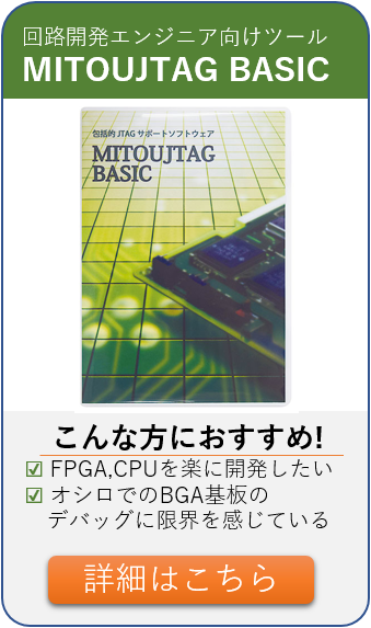 MITOUJTAG(みとうジェイタグ)はFPGAやCPUなど、組み込みデバイスのためのデバッグ・ツールです。このツールを使うと、オシロスコープでは見ることができないBGAの裏側の端子や多層基板内層の信号を、見たり操作したりできるようになります。