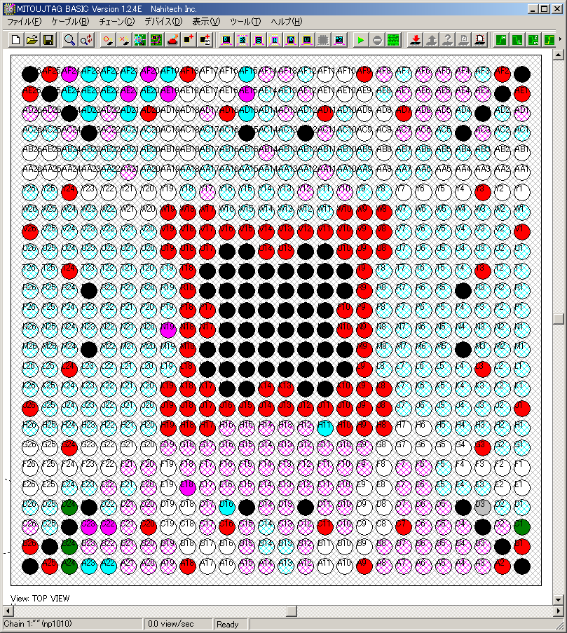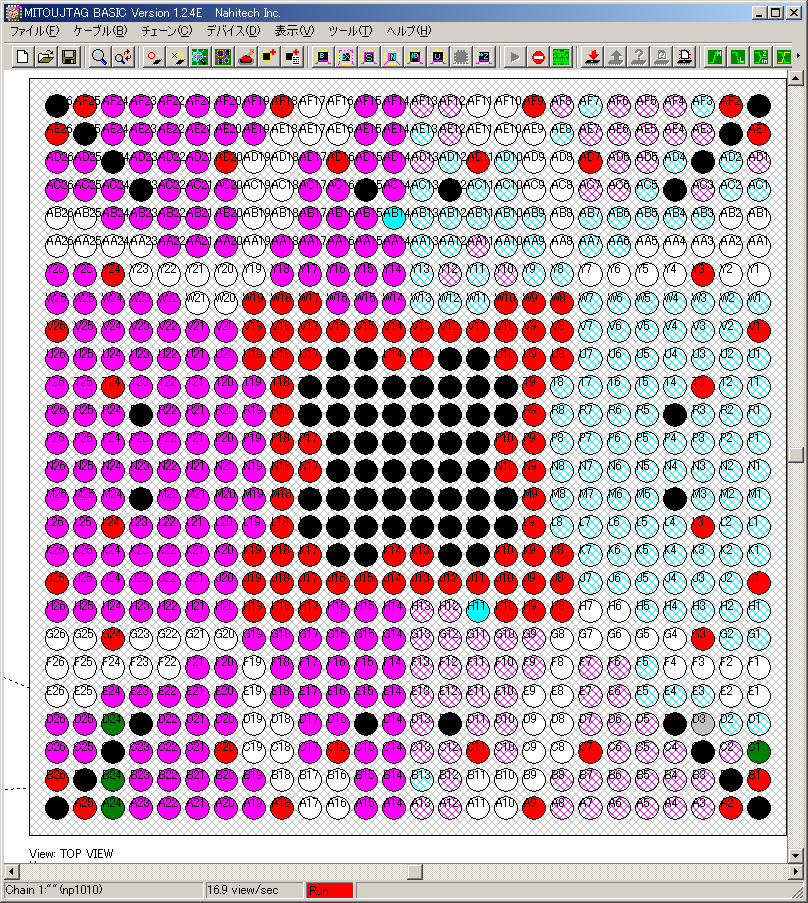 下の図は、あるIC(XC3S1000FG676)の一部の端子の状態を可視化したものです。