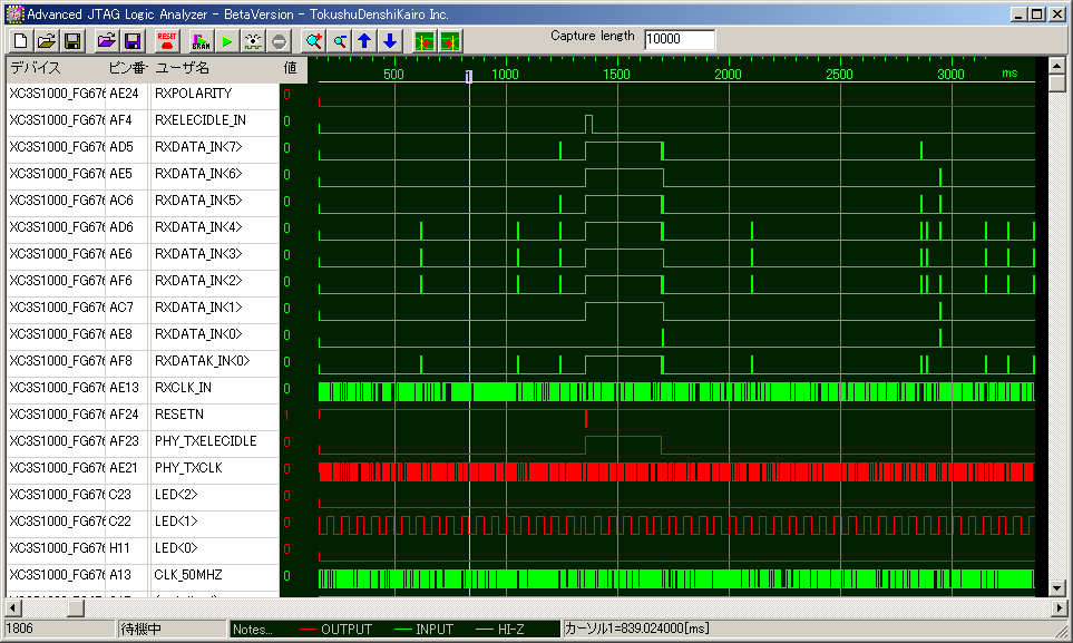 このように、FPGAやCPUが入出力する信号を、波形として表示させることができます。しかも、観測できる信号の本数に制限はありません。例えば、FPGAに1500本のI/Oがあれば、1500個の信号を観測することができます。