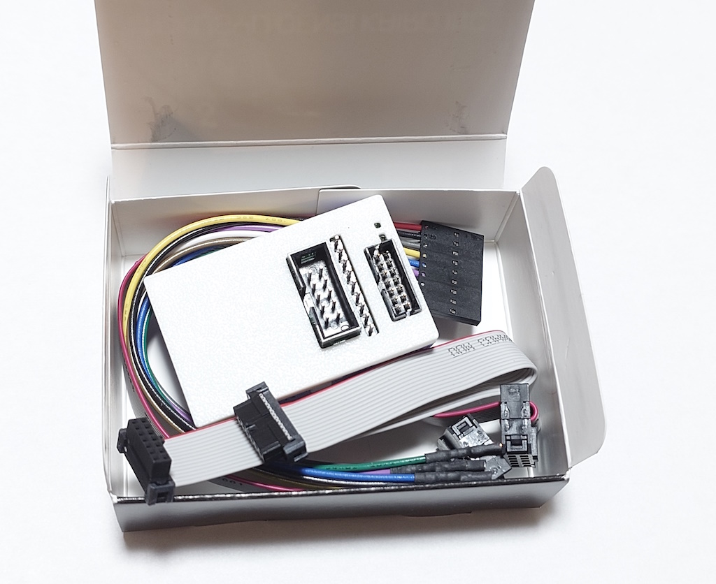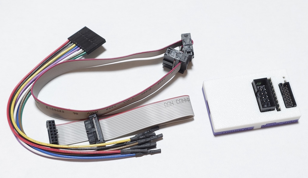 ターゲット基板と接続するためのケーブルとして、14pin 2mmピッチのリボンケーブルと、10pin 2.54mmピッチのフラットケーブル、9ピンのフライリードケーブルが付属しています。フライリードケーブルとは、先がバラになったケーブルのことを意味します。