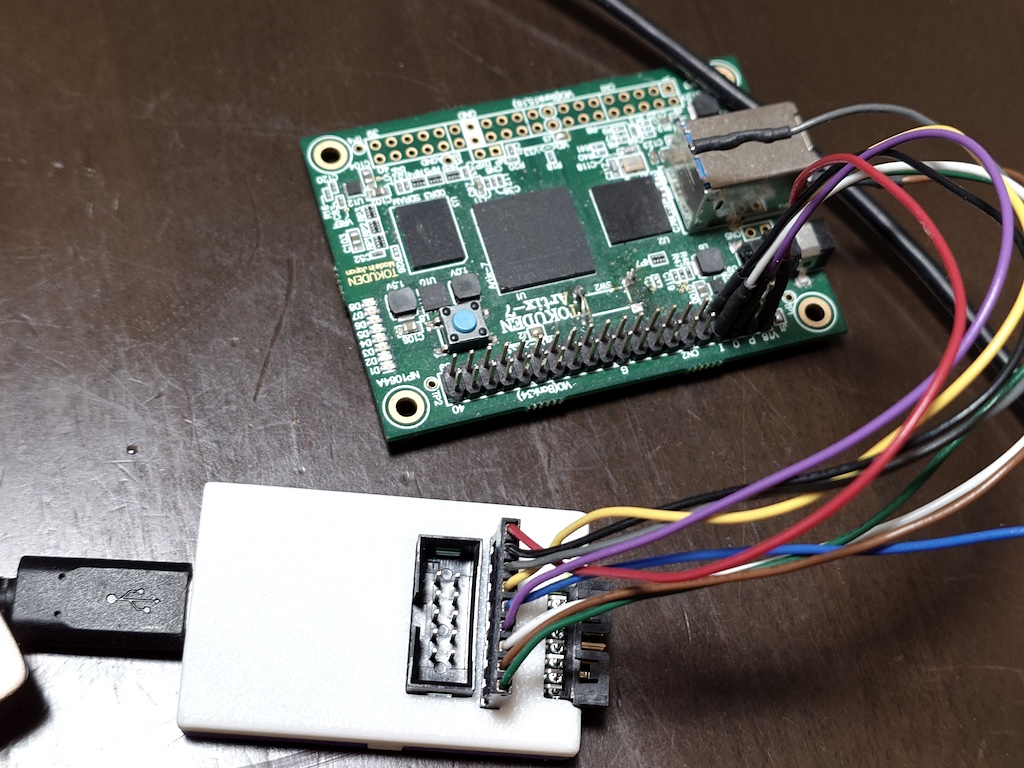 JTAGがピンヘッダから出ているターゲット基板へは、付属のフライリードケーブルを使って接続します。