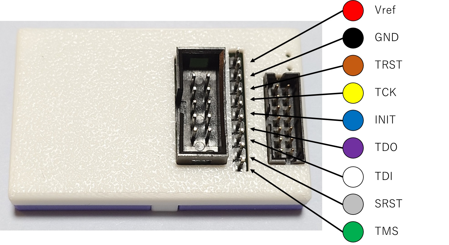 9ピンピンヘッダのピン配置を下の図に示します。TRSTとINITとSRSTは、特に使用目的は決められていません。通常のFPGAボードでは接続する必要はありません。