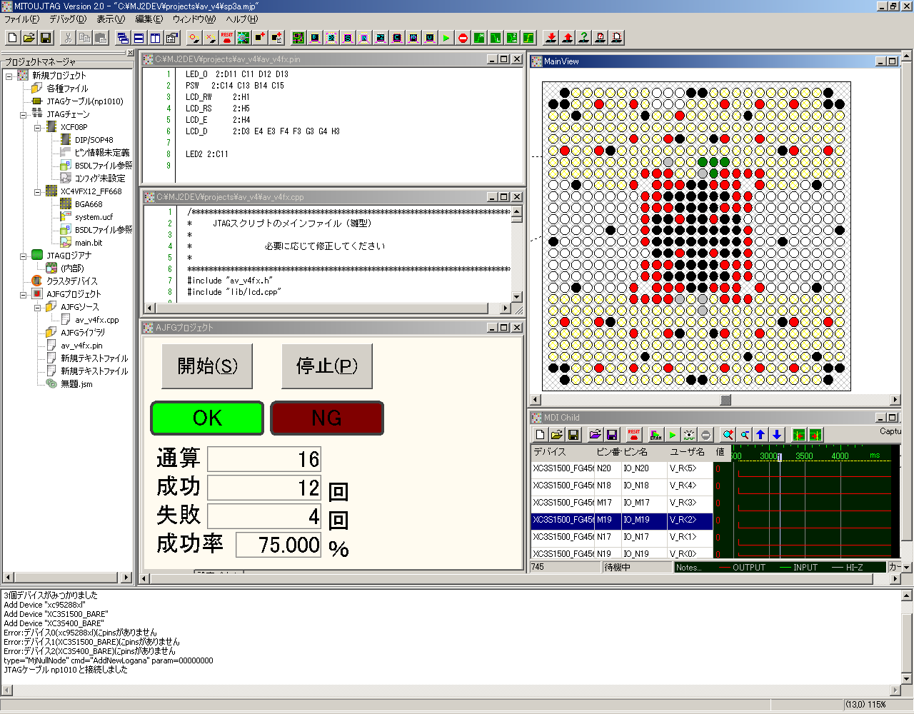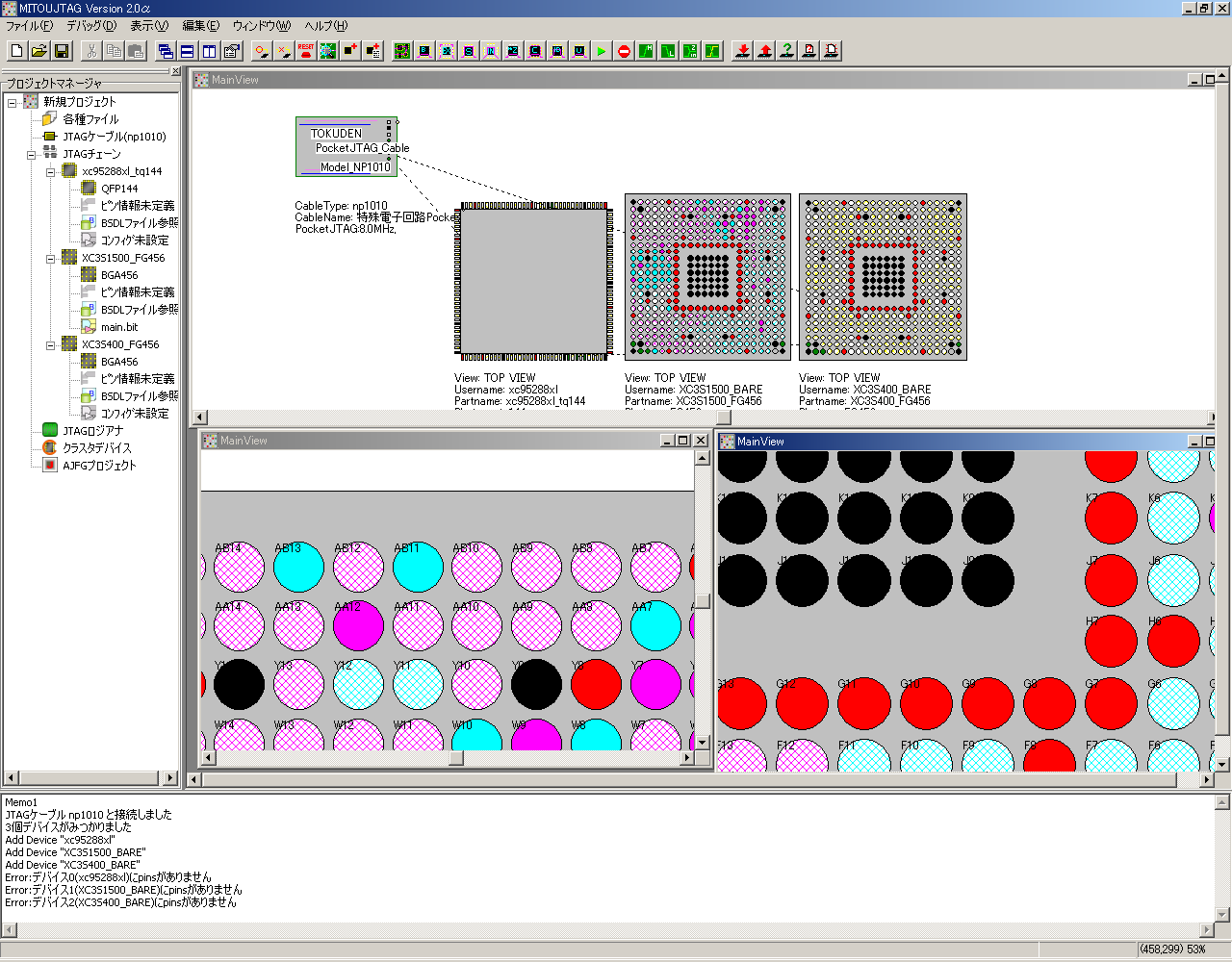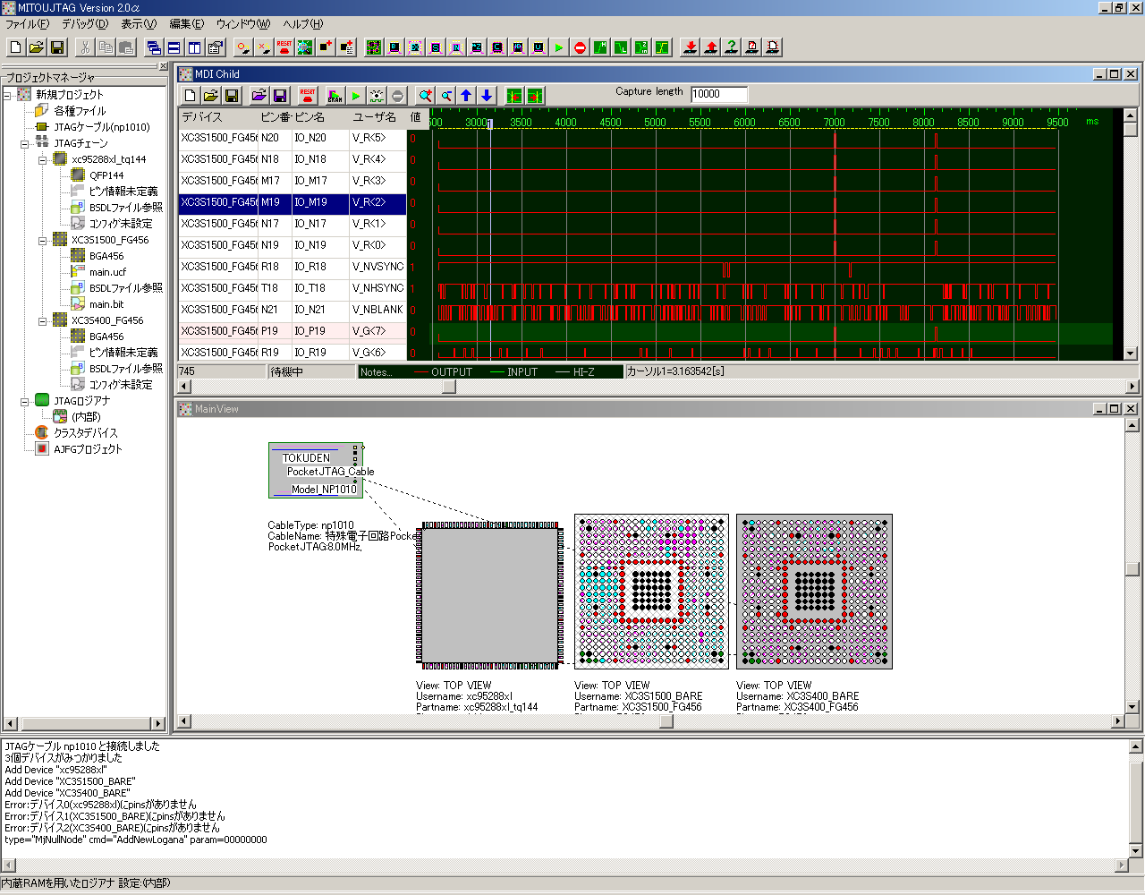 MITOUJTAG Pro版のメイン画面です。 左側に現在のプロジェクトツリーが、下側にメッセージログが表示される3ペイン構成です。 メインのビューはMDIアプリケーションとなり、様々な角度からJTAGチェーンを眺めることができます。 |
