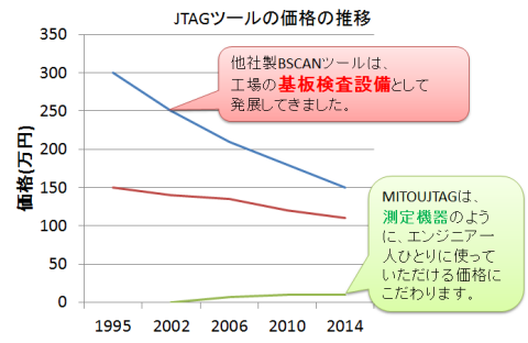 なぜならば、他社のJTAGバウンダリスキャンツールは基板工場の検査用設備として発展してきたため、非常に高額です。最近ではいくぶん安価になってきていますがそれでも1台あたり100万円以上します。要するにもともと工場の設備なので、当然のように高い値段が付けられていて、その価格は非公開で、お客様の足元を見て上下されています。