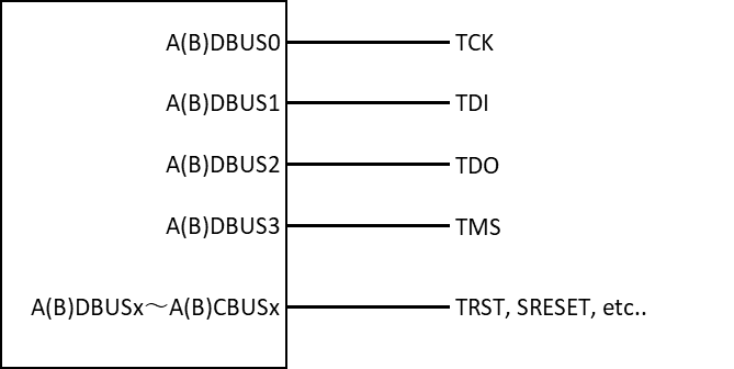 MPSSEモードを使うには、ADBUS0にTCKを、ADBUS1にTDIを、ADBUS2にTDOを、ADBUS3にTMSを接続します。ADBUS0~3はMPSSEによってハードウェア的に動作するのでこの割り当ては決まっています。