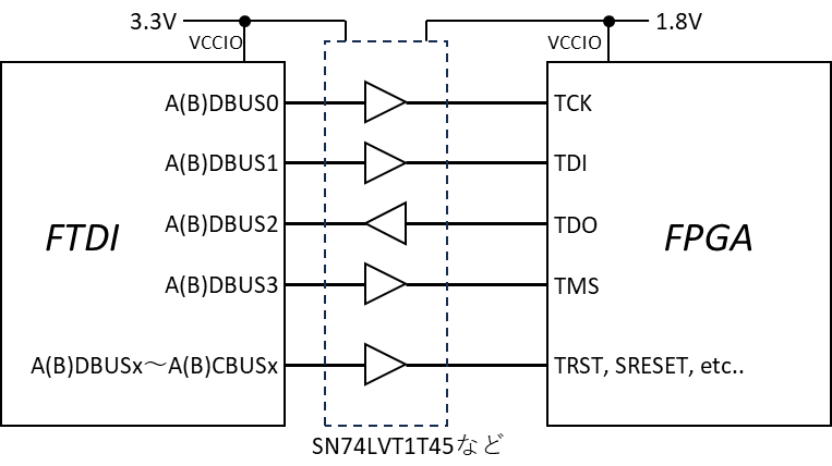 FTDIデバイスのVCCIOは3.3V固定(2.97V~3.63V)なので、ターゲットとなるFPGAやCPUが