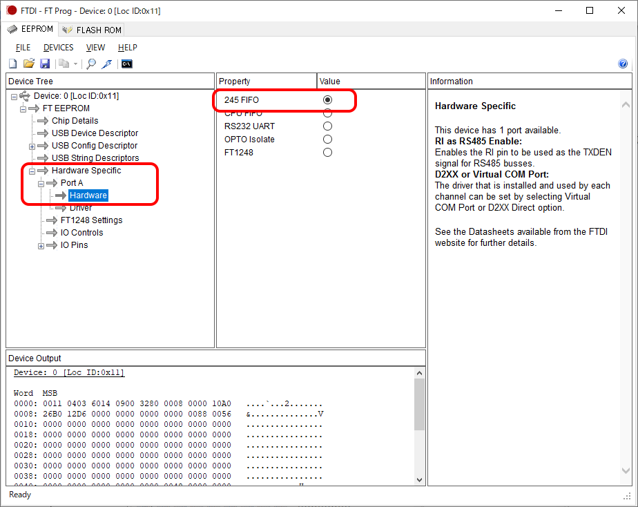 画面左のHardware Specificツリーを展開したらPort AのHardwareを開き、245 FIFOを選択してください。(デフォルトはRS232 UARTになっている)