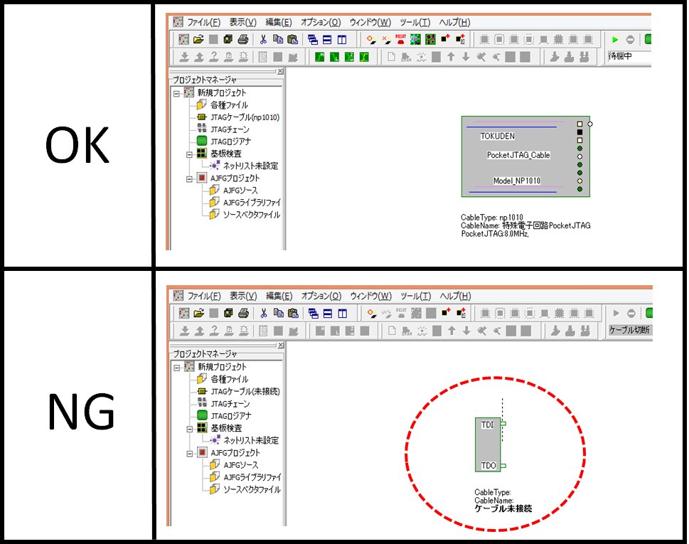 PCとケーブルを接続時、下表’NG’のようにケーブル未接続と表示された場合、Pocket JTAG Cableの認識を確認する必要があります。Pocket JTAG Cableの認識を確認する必要があります。