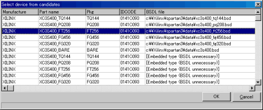 すると、次の図のように同じJTAG IDCODEを持つデバイスの一覧が表示されますので、「XC3S400_FT256」を選択します。