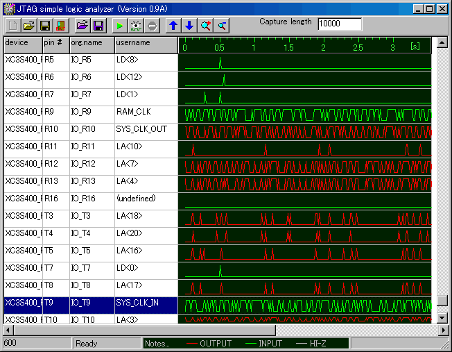 また、デバイスの絵を右クリックして「load pin definition」を選択し、SUZAKUのCDROMの中にある"top.ucf"を読み込みます。そして、MITOUJTAGのToolメニューからJTAGロジックアナライザを起動します。