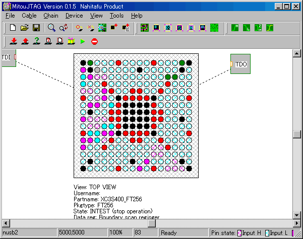 MITOUJTAGでは、EXTESTあるいはINTEST状態で端子の絵をクリックすると、その端子を自由自在に操作することができます。下の図はSUZAKUのFPGAに対してINTESTを実行している最中の図です。