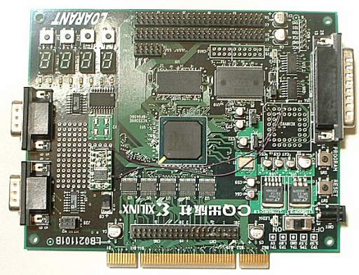 この評価ボードは下の図のような外観をしています。SpartanIIEのほかには、LVDSインタフェースや、SDRAM、フラッシュROM、そしてPCIコネクタがついています。