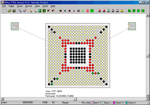 評価ボードとMITOUJTAGを実行するPCをJTAGで接続し、評価ボードの電源を入れるとXC2S300Eが認識されます。