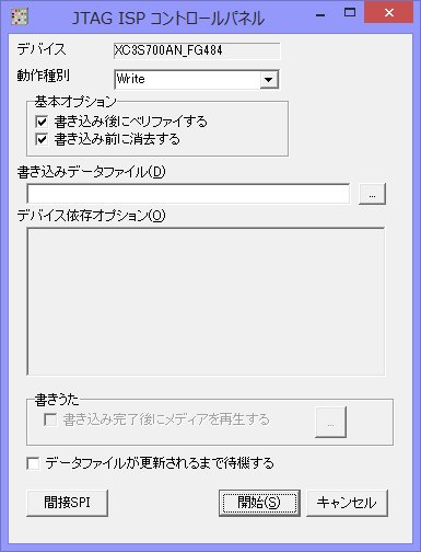 次のダイアログが開くので、「書き込みデータファイル」の欄に書き込みたいBitStreamファイルを指定してください。