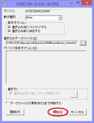 XILINXデバイスの書き込みの例として、Spartan-3AN評価ボードを使用します。