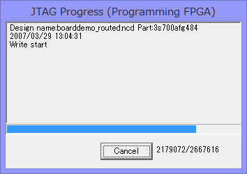Spartan-3なら2秒程度、Spartan-6なら10秒、Artix-7やZYNQは20秒程度で書き込みが行われます。それ以上かかるようであれば、何らかのエラーが起きています。