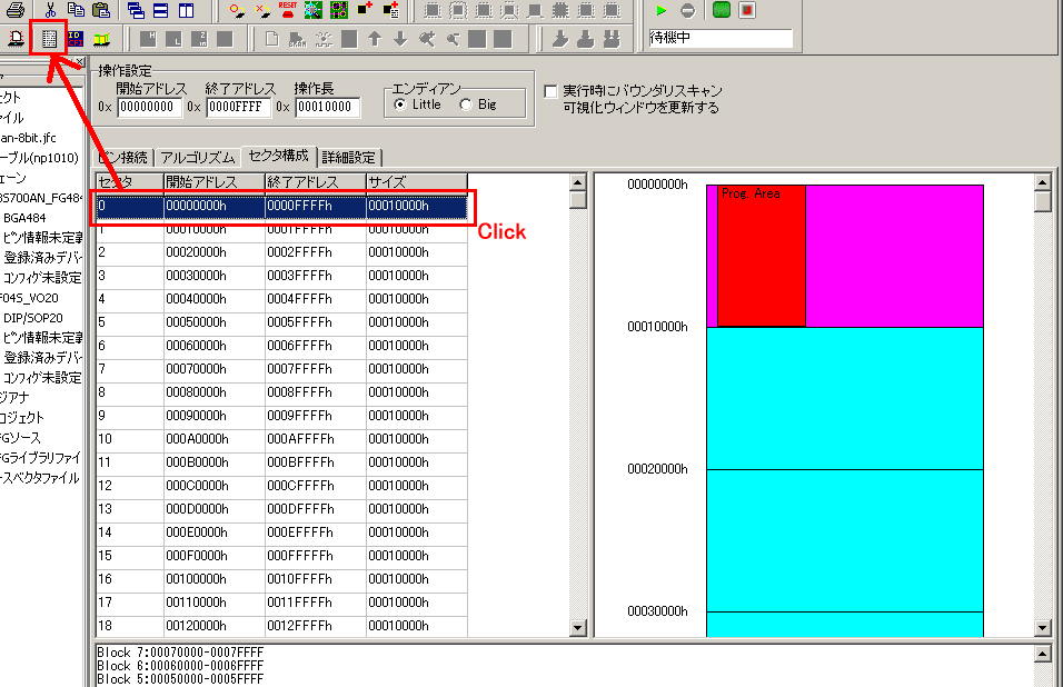 ここで、「セクタ消去」を選択すると現在選択されているセクタのみが消去され、「チップ全体」を選択するとチップ全体を消去します。
