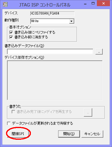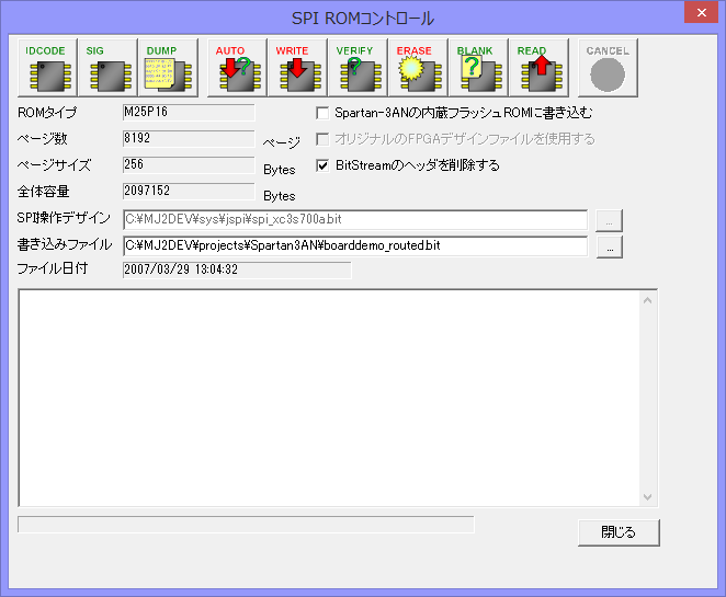 上記のダイアログで「書き込みファイル」のところに書き込みたいBitStreamファイルを指定して、AUTOと書かれたボタンを押すと、SPI ROMへの書き込みが行われます。