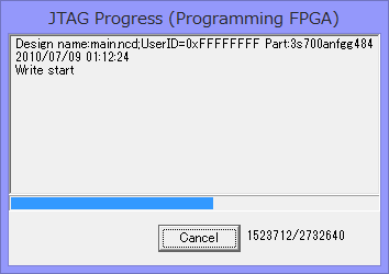進捗バーが現れて、FPGAに一時的なデザイン(JTAG経由でSPIコマンドを発行する一時BitStream)が自動的に書き込まれます。