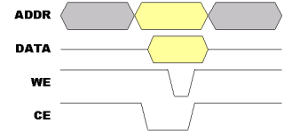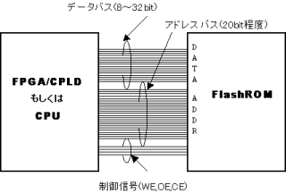 フラッシュROMの内容を読み書きするためには、図2のように、フラッシュROMのアドレスバスやデータバスに値を設定し、CEやWE、OEなどの制御信号を操作することで行います。