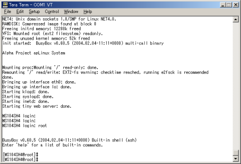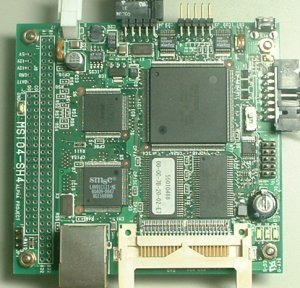 MS104-SH4はCPUの他にRAMとROM、LAN、コンパクトフラッシュコネクタが搭載されています。電源を入れて起動すると、数十秒でLinuxが起動します。