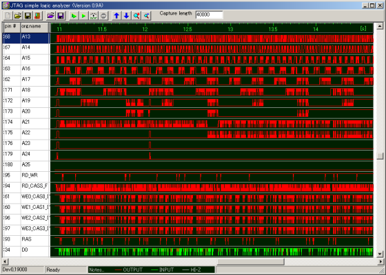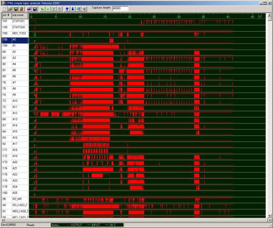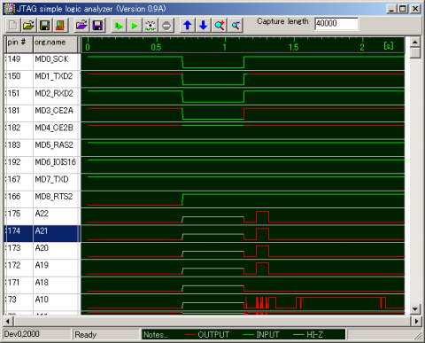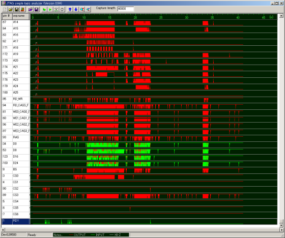 ロジックアナライザを起動したら、Mobile JTAG Cableの非同期モードでキャプチャを開始します。非同期モードでは、ほぼ1ms周期でSH-4の全IOの状態を取得しつつけます。