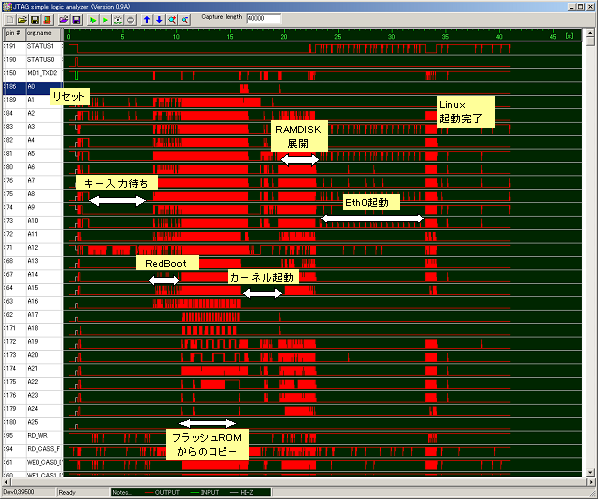 リセット後、RedBootの起動、フラッシュROMからのカーネルイメージのコピー、カーネル起動、RAMDISKの展開、イーサネットの起動、Linux起動完了までのアドレスバスの動作を解析しています。