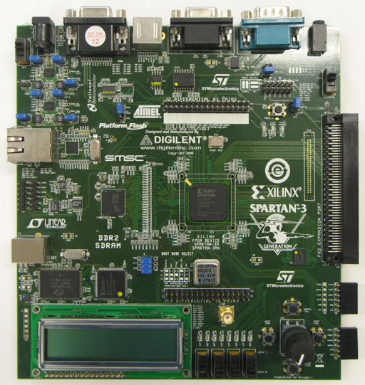 このボードにはFPGAのほか、コンフィグROM(XCF04S)、2種類のSPIフラッシュメモリ、DDR2 SDRAM、NOR型フラッシュメモリ、LANコントローラ、液晶ディスプレイ、各種スイッチ、オーディオチップなどが搭載されています。