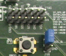 JTAG信号は基板の右上の位置にあるコネクタJ25に出ています。 このコネクタは2列になっていて、上の段がJTAG用、下の段がSPI用となっています。USBコネクタに何もつながなければ、このJTAGコネクタはデフォルトで有効になっています。