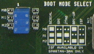 コンフィギュレーションROMから起動する場合、J26は3つあるすべてのジャンパをショートします。このジャンパの状態を変えると、SPI ROMやBPI ROMから起動させることができます。