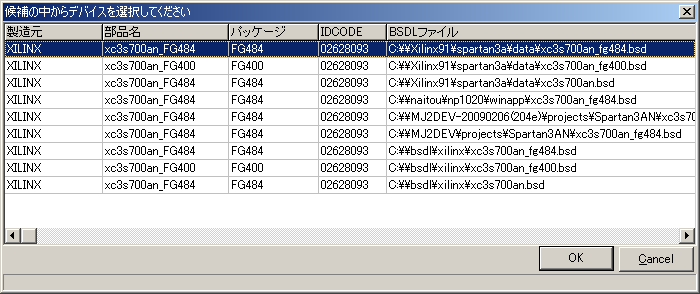 最初のデバイスはXC3S700AN(あるいはXC3S700A)です。候補を選ぶダイアログが出るので、FG484ピンのものを選択します。複数の候補が表示された場合は、どれを選択しても構いません。