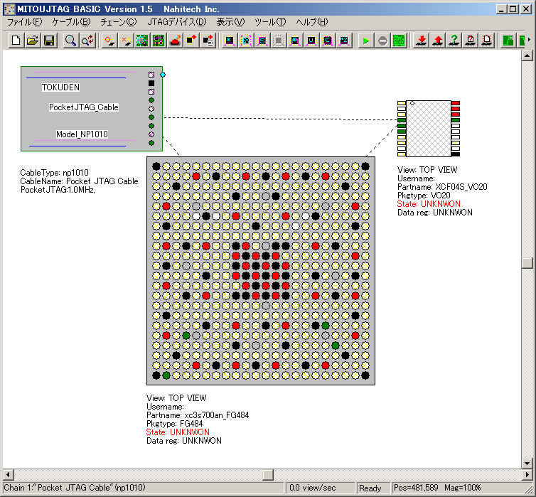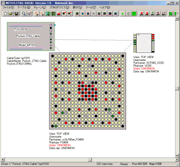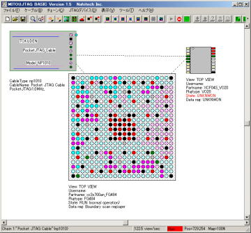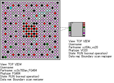 」ボタンを押すと、バウンダリスキャンが行われ、BGAの1個1個の端子の状態が、赤や青の色で表示されます。