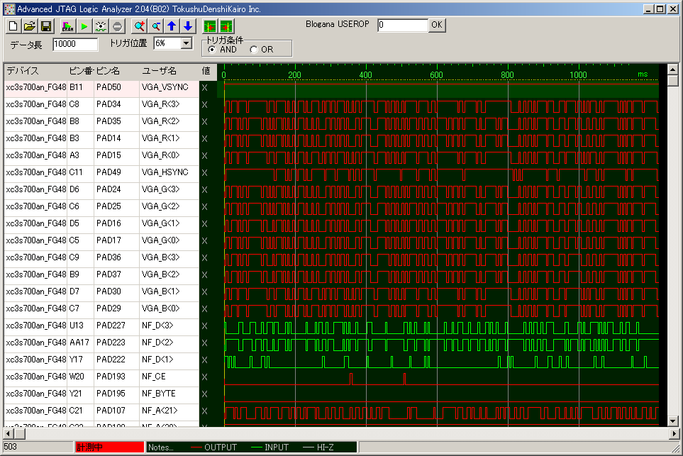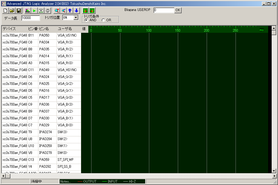 」を押すと、JTAGロジックアナライザが起動します。前の操作でUCFファイルを読み込んでおけば、各信号に名前が自動でセットされているはずです。
