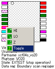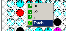 HIと書かれたアイテムを選択すると、その端子がHレベルになります。同様にLOを選択すればLレベルに、Zを選択すればハイインピーダンス(もしくは入力)に、Toggleを選択すれば現在の状態が反転します。