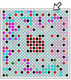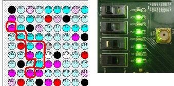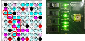 そして、左上のほうに1つだけLを出力している(水色で塗りつぶされた)端子が見えますが、これはDONEピンです。また、いくつかの端子については、網掛けのままピンクと水色に点滅しているのがわかります。これは、FPGAの外から入力されたクロック信号です。