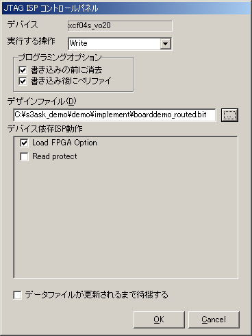 このダイアログで「データファイルが更新されるまで待機する」のチェックボックスをONにすると、BitファイルやMCSファイルが更新されるまで書き込みを保留します。論理合成に時間がかかるような場合は、このチェックボックスをONにして書き込みを予約しておけば、論理合成完了と同時に書き込まれるのでパソコンの前から離れることができます。