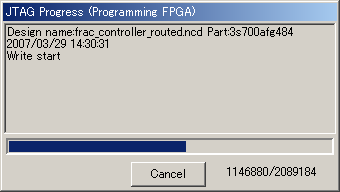 次に、ツールバーの「」ボタンを押します。書き込みコントロールダイアログが開くので、「デザインファイル」のところにBitファイル名を指定します。コンフィグROMに書き込む場合でも.bitを指定することができます。MITOUJTAGの中でbit→mcsへの変換は自動的に行われます。