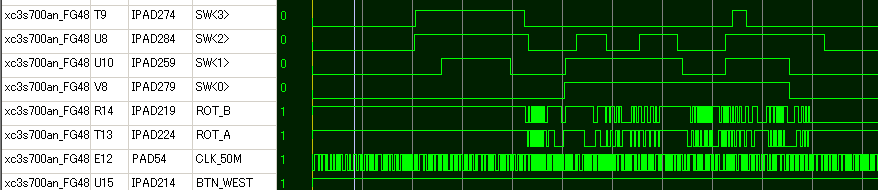 次の図は、FPGA起動前の状態で、基板上のロータリエンコーダを回したり、スライドスイッチを動かしたときの端子の状態を波形としてキャプチャしたものです。FPGAが起動していないのに、クロックやスイッチなどの入力が見えているのがわかります。