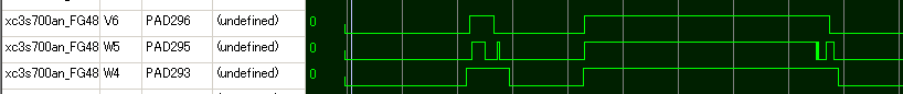 表示された波形のうち、赤で表示されたものは出力信号、緑で表示されたものは入力信号を表します。波形をよく見ると、LCD、NORフラッシュ、SPIフラッシュは常にアクセスされているようですが、DDR2 SDRAMは一切アクセスがされていないことがわかります。