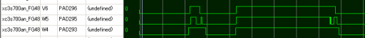 XILINX FPGAは、モードピン(M0~M2)の設定を間違えると起動することができません。しかし、MITOUJTAGを使えば、コンフィギュレーション前であっても、FPGA(XC3S700A FG484)のモードピンの状態を見ることができます。Spartan-3A評価ボードでは、モードピンはジャンパJ26に出ているので、このジャンパを抜き差してキャプチャした波形を次の図に示します。