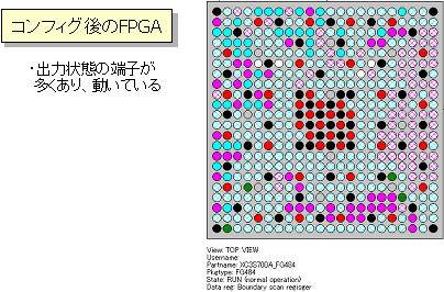 FPGAがコンフィギュレーションに成功しているかどうか、MITOUJTAGを使えば一目でわかります。コンフィギュレーションに成功したFPGAは、Hレベル、Lレベル、入力、出力と、端子がにぎやかに動いています。