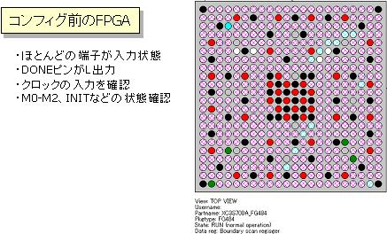 MITOUJTAGを使うと、普通のFPGA設計方法では絶対に操作できない、「コンフィグ関連端子」をマウスクリックで操作し、コンフィグROMとFPGA間の接続や、それらの機能が正しく動作しているかを調べることができます。