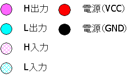 この図で表示された端子の色は、赤(ピンク)がHレベル、青(水色)がLレベル、塗りつぶしが出力信号、網掛けが入力信号であることを示しています。真っ赤と真っ黒は電源ピンです。