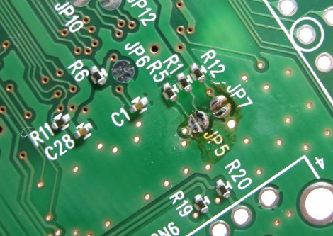 ついでにJP5もカットします。これによってEMLE(エミュレータイネーブル)という信号が有効になって、JTAG デバッグが可能になります。[EMLEの解説はこちら]