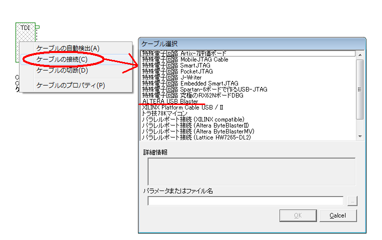 ケーブルの接続を行う際に、右クリックでポップアップメニューを出し、USB-Blasterを選択してください。