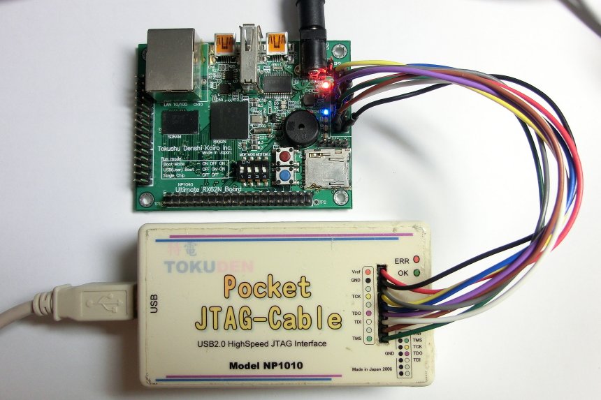 ターゲットボードとパソコンを専用のUSB-JTAGケーブルでつなぎます。